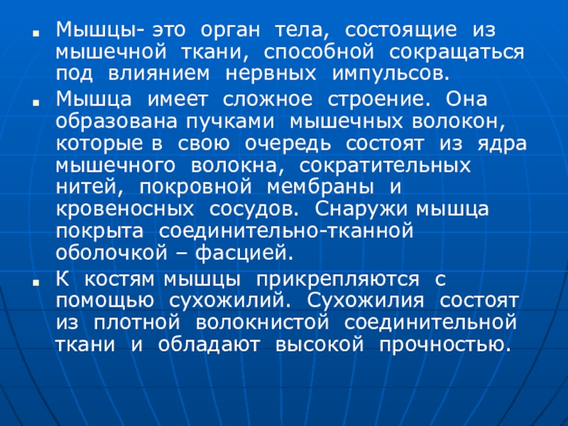 Мышцы- это орган тела, состоящие из мышечной ткани, способной сокращаться под влиянием нервных импульсов.Мышца имеет сложное строение.