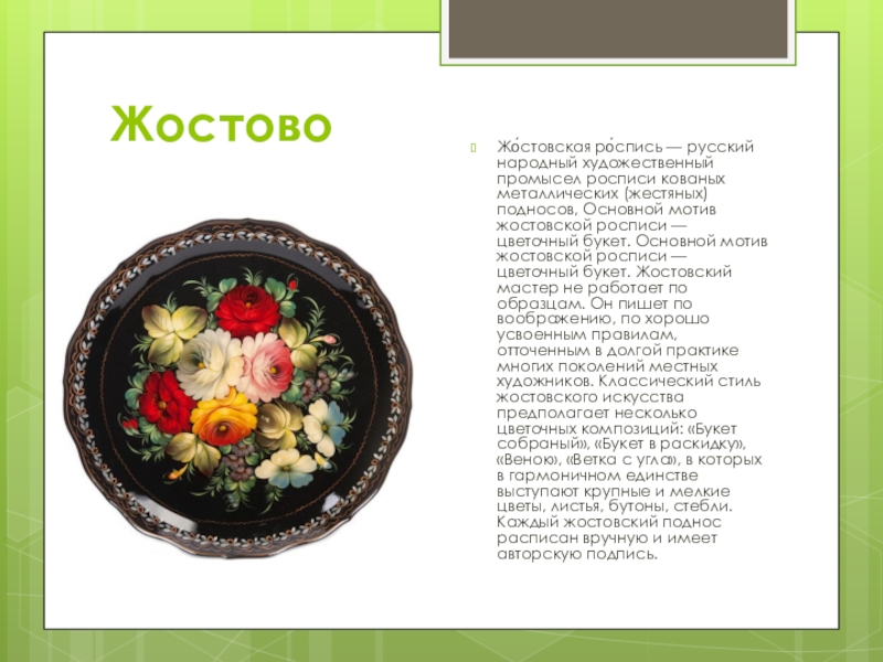 подносов, Основной мотив жостовской росписи — цветочный букет. Основной мотив жостовской росписи — цветочный букет. Жостовский мастер не работает по образцам. Он пишет по воображению, по хорошо усвоенным правилам, отточенным в долгой практике многих поколений местных художников. Классический стиль жостовского искусства предполагает несколько цветочных композиций: «Букет собраный», «Букет в раскидку», «Венок», «Ветка с угла», в которых в гармоничном единстве выступают крупные и мелкие цветы, листья, бутоны, стебли. Каждый жостовский поднос расписан вручную и имеет авторскую подпись.