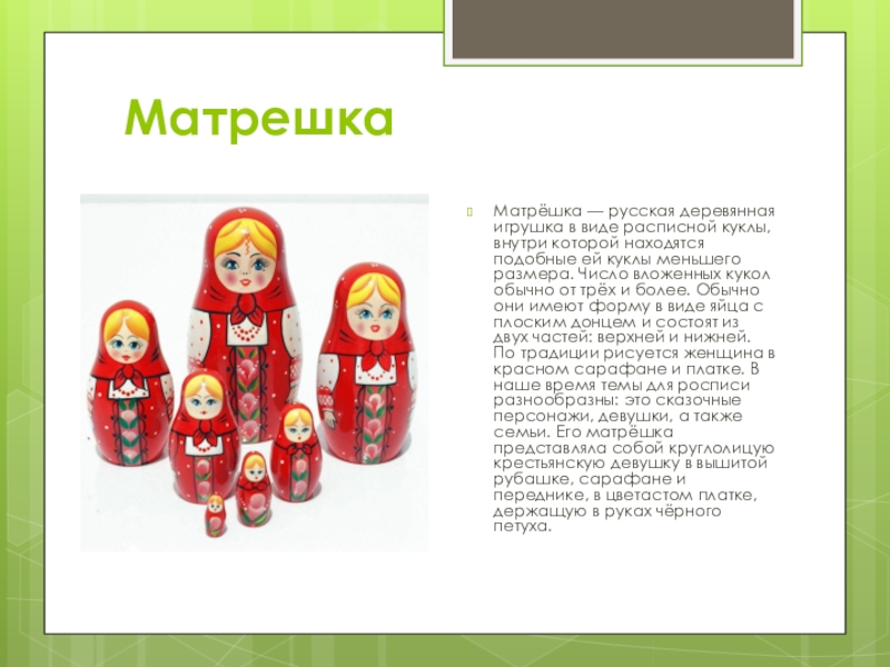 Матрёшка — русская деревянная игрушка в виде расписной куклы, внутри которой