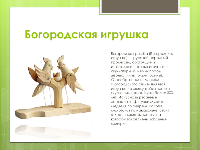 изготовлении резных игрушек и скульптуры из мягких пород дерева (липы, ольхи, осины). Своеобразным символом «Богородского стиля» является игрушка на движущейся планке «Кузнецы», которой уже более 300 лет. Искусно вырезанные деревянные фигурки мужика и медведя по очереди колотят молотами по наковальне, стоит только подвигать планку, на которой закреплены забавные фигурки.