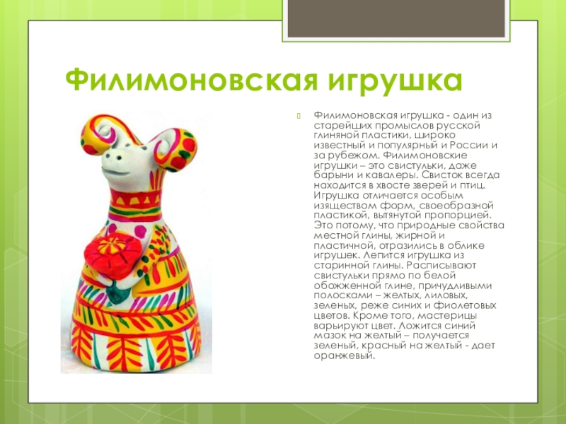 широко известный и популярный и России и за рубежом. Филимоновские игрушки – это свистульки, даже барыни и кавалеры. Свисток всегда находится в хвосте зверей и птиц. Игрушка отличается особым изяществом форм, своеобразной пластикой, вытянутой пропорцией. Это потому, что природные свойства местной глины, жирной и пластичной, отразились в облике игрушек. Лепится игрушка из старинной глины. Расписывают свистульки прямо по белой обожженной глине, причудливыми полосками – желтых, лиловых, зеленых, реже синих и фиолетовых цветов. Кроме того, мастерицы варьируют цвет. Ложится синий мазок на желтый – получается зеленый, красный на желтый - дает оранжевый.