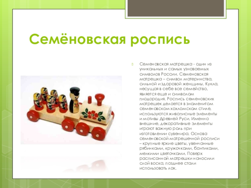 России. Семеновская матрешка – символ материнства, сильной и здоровой женщины. Кукла, несущая в себе все семейство, является еще и символом плодородия. Роспись семеновских матрешек делается в знаменитом семеновском хохломском стиле, используются живописные элементы и мотивы Древней Руси. Именно внешние, декоративные элементы играют важную роль при изготовлении сувенира. Основа семеновской матрешечной росписи – крупные яркие цветы, увенчанные рябинками, кружочками, бантиками, мелкими цветочками. Поверх расписанной матрешки наносили слой воска, позднее стали использовать лак.