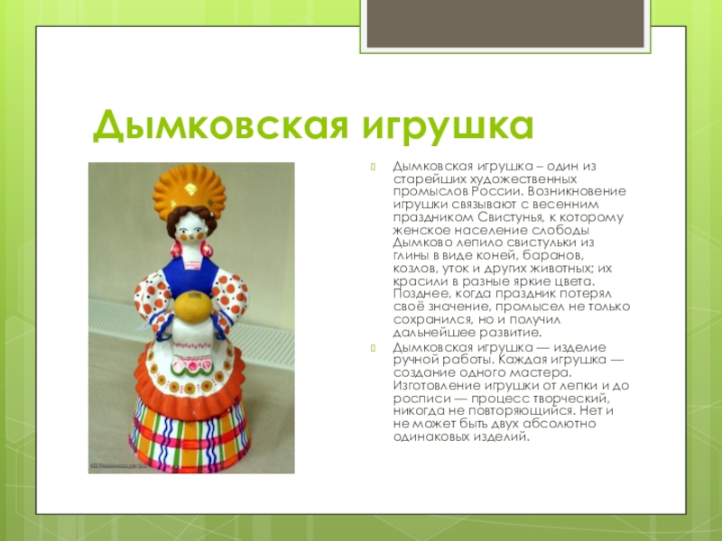 Дымковская игрушка – один из старейших художественных промыслов России. Возникновение