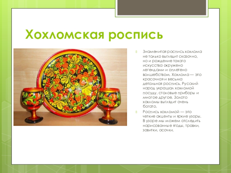 такого искусства окружено легендами и оплетено волшебством. Хохлома — это красочная и весьма детальная роспись. Русский народ украшал хохломой посуду, столовые приборы и многое другое. Золото хохломы выглядит очень богато.