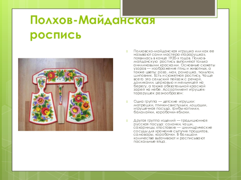 в конце 1920-х годов. Полхов-майданскую роспись выполняют только анилиновыми красками. Основные сюжеты узоров — изображения птиц и животных, а также цветы: роза, мак, ромашка, тюльпан, шиповник. Есть и сюжетная роспись. Чаще всего это сельский пейзаж с речкой, домиками, церковью и мельницей на берегу, а также обязательной красной зарей на небе. Ассортимент игрушек-тарарушек разнообразен: