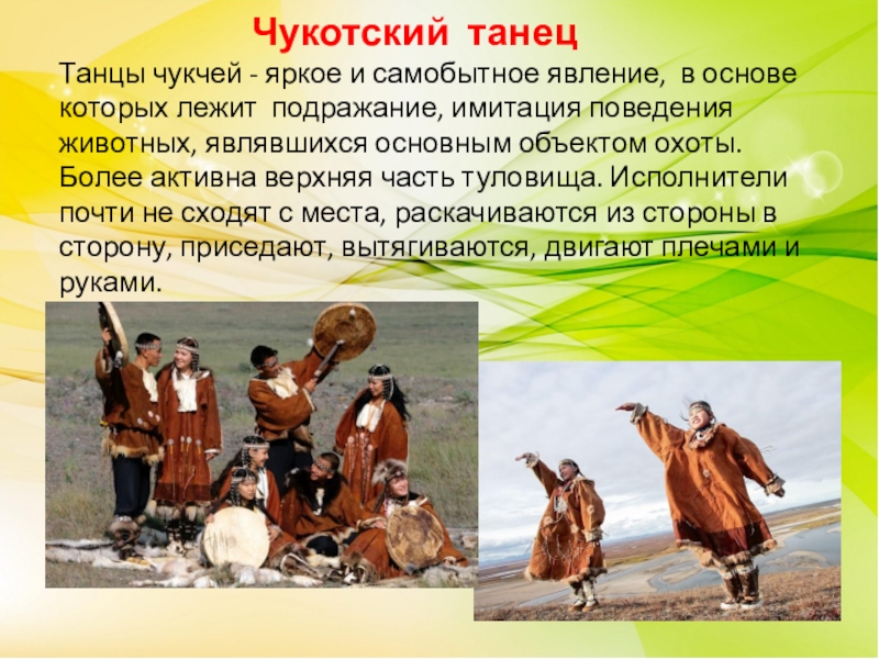 Танцы чукчей - яркое и самобытное явление, в основе которых лежит подражание, имитация поведения животных, являвшихся основным объектом охоты. Более активна верхняя часть туловища. Исполнители почти не сходят с места, раскачиваются из стороны в сторону, приседают, вытягиваются, двигают плечами и руками.