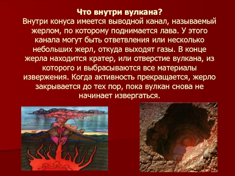 Слайд 4Что внутри вулкана? Внутри конуса имеется выводной канал, называемый жерлом, по которому