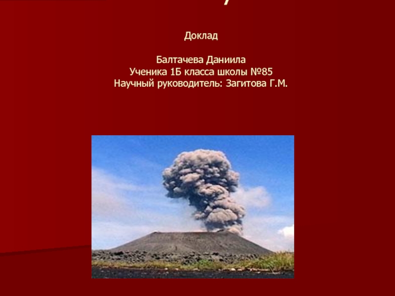 Слайд 1Что такое вулканы? Доклад Балтачева Даниила Ученика 1Б класса школы №85 Научный руководитель: Загитова Г.М.