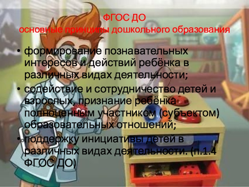 ФГОС ДО основные принципы дошкольного образованияформирование познавательных интересов и действий ребёнка в различных видах деятельности;содействие и сотрудничество детей и взрослых, признание ребёнка полноценным участником (субъектом) образовательных отношений;поддержку инициативы детей в различных видах деятельности. (п.1.4 ФГОС ДО)