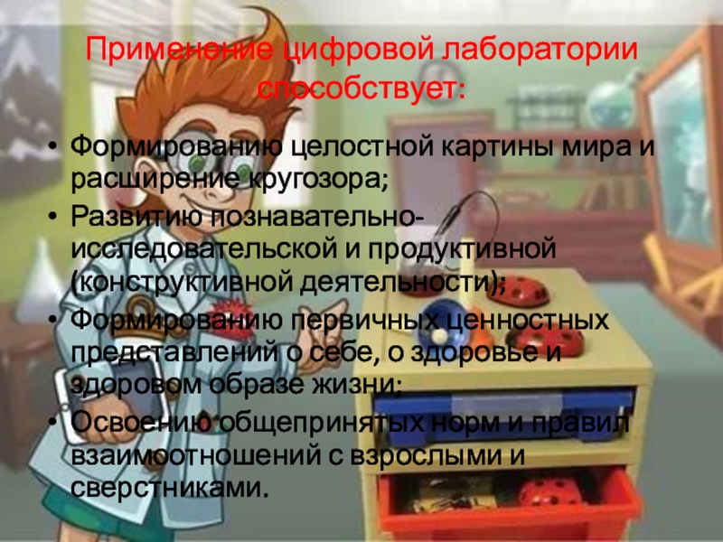 Применение цифровой лаборатории способствует:Формированию целостной картины мира и расширение кругозора;Развитию познавательно- исследовательской и продуктивной (конструктивной деятельности);Формированию первичных