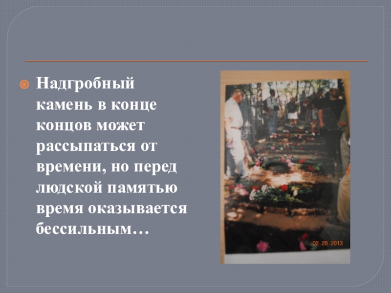 Слайд 30Надгробный камень в конце концов может рассыпаться от времени, но перед
