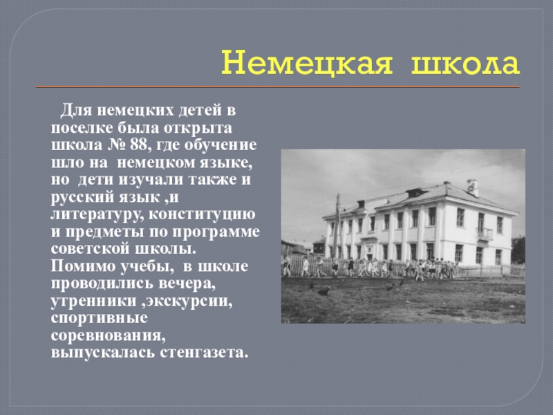 где обучение шло на немецком языке, но дети изучали также и русский язык ,и литературу, конституцию и предметы по программе советской школы. Помимо учебы, в школе проводились вечера, утренники ,экскурсии, спортивные соревнования, выпускалась стенгазета.