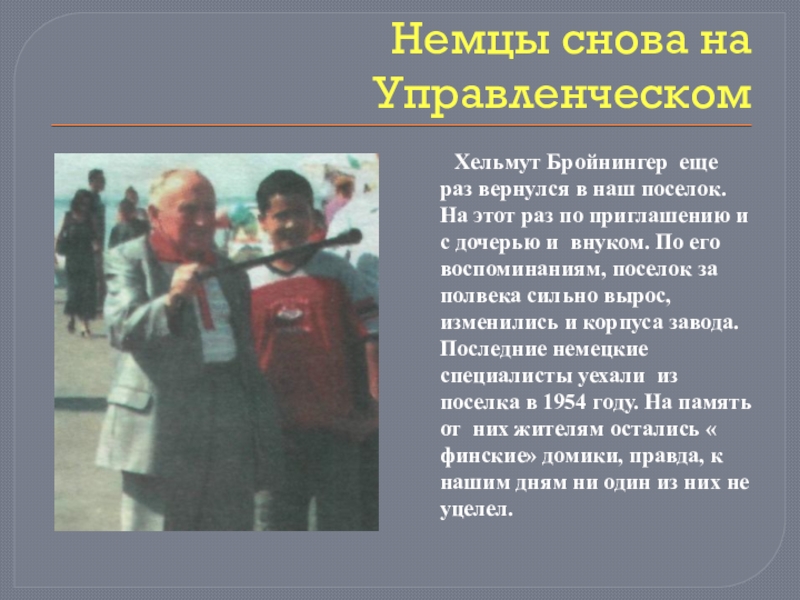 На этот раз по приглашению и с дочерью и внуком. По его воспоминаниям, поселок за полвека сильно вырос, изменились и корпуса завода. Последние немецкие специалисты уехали из поселка в 1954 году. На память от них жителям остались « финские» домики, правда, к нашим дням ни один из них не уцелел.