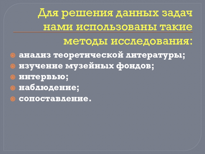 Слайд 4Для решения данных задач нами использованы такие методы исследования: