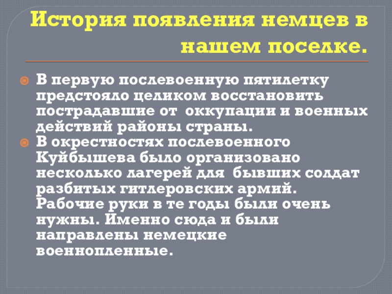 В окрестностях послевоенного Куйбышева было организовано несколько лагерей для бывших солдат разбитых гитлеровских армий. Рабочие руки в те годы были очень нужны. Именно сюда и были направлены немецкие военнопленные.