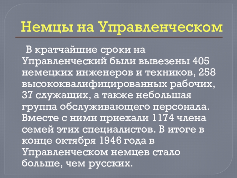 инженеров и техников, 258 высококвалифицированных рабочих, 37 служащих, а также небольшая группа обслуживающего персонала. Вместе с ними приехали 1174 члена семей этих специалистов. В итоге в конце октября 1946 года в Управленческом немцев стало больше, чем русских.