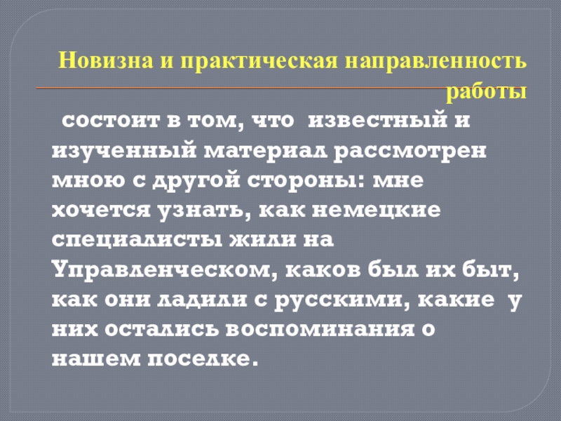 материал рассмотрен мною с другой стороны: мне хочется узнать, как немецкие специалисты жили на Управленческом, каков был их быт, как они ладили с русскими, какие у них остались воспоминания о нашем поселке.