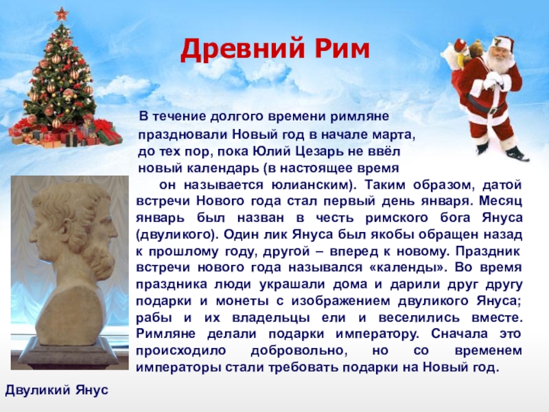 Когда в России стали отмечать Новый год, в домах стал появляться старый дед с бородой и в валенках. Но тогда Дед Мороз не был веселым и добродушным. В одной руке у него был мешок, а в другой палка. Подарки он, конечно, дарил, но только умным и послушным детям, остальным хорошенько доставалось палкой. Но годы шли, и Дед Мороз добрел и старел, перестал раздавать тумаки, а просто запугивал непослушных детей страшными сказками.