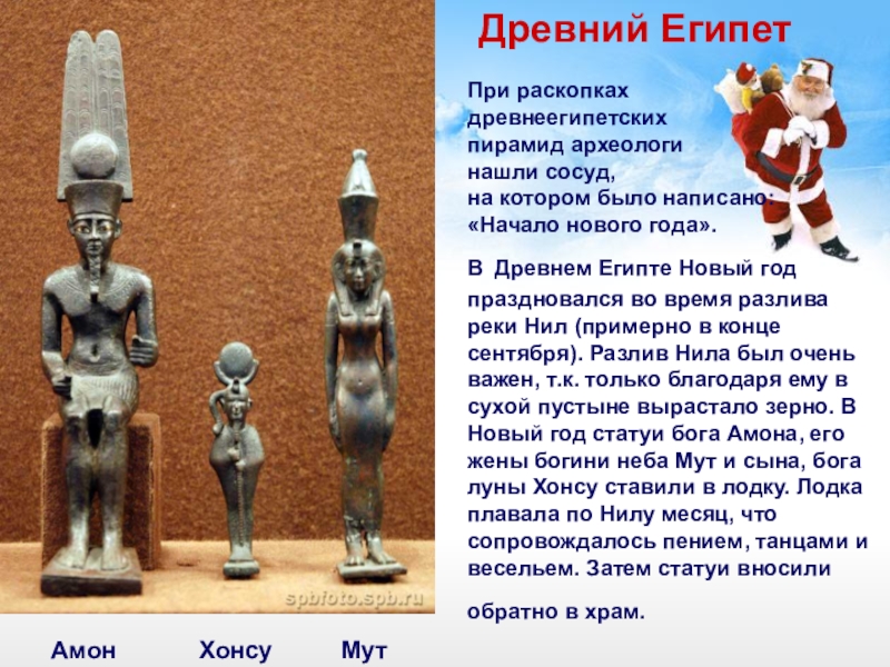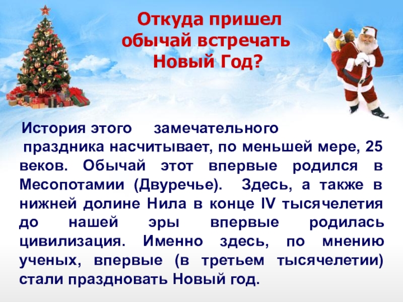 праздника насчитывает, по меньшей мере, 25 веков. Обычай этот впервые родился в Месопотамии (Двуречье). Здесь, а также в нижней долине Нила в конце IV тысячелетия до нашей эры впервые родилась цивилизация. Именно здесь, по мнению ученых, впервые (в третьем тысячелетии) стали праздновать Новый год.