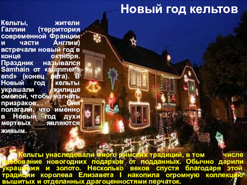 Кельты унаследовали много римских традиций, в том числе требование новогодних подарков от подданных. Обычно дарили украшения и золото. Несколько веков спустя благодаря этой традиции королева Елизавета I накопила огромную коллекцию вышитых и отделанных драгоценностями перчаток.