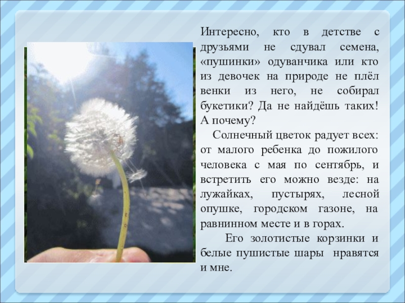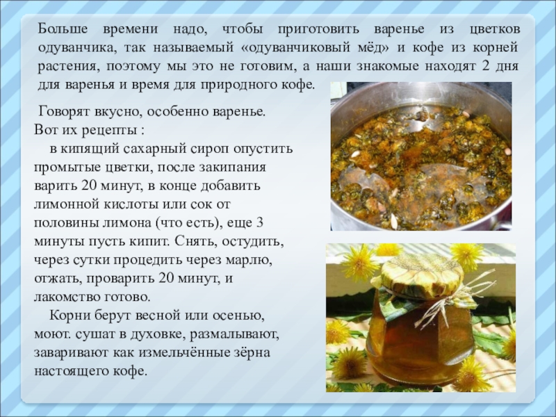 Корень одуванчика помогает при сахарном диабете, в нём есть вещество, снижающее уровень сахара в крови.