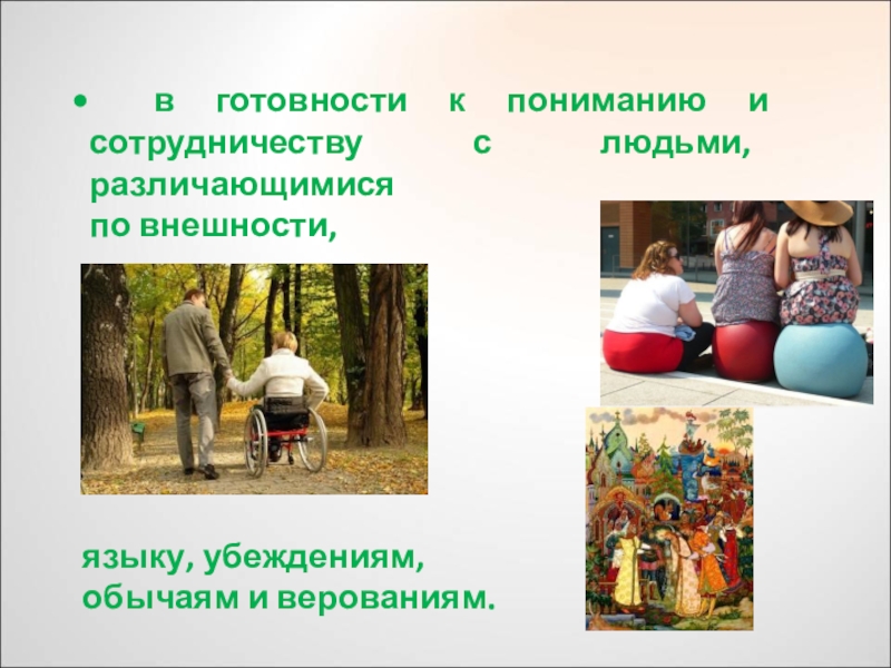 Толерантность обеспечивает сохранение разнообразия, естественного права на отличность, непохожесть, инаковость.