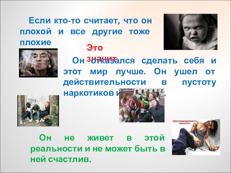 Он отказался сделать себя и этот мир лучше. Он ушел от действительности в пустоту наркотиков и алкоголя.