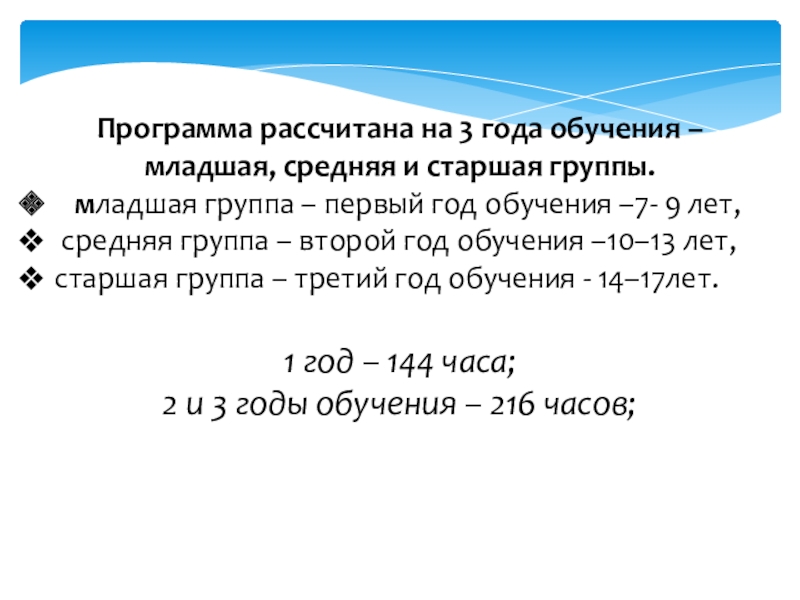 Слайд 15Программа рассчитана на 3 года обучения – младшая, средняя и старшая