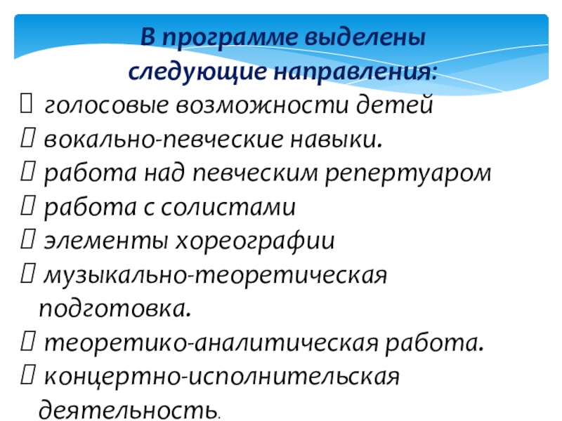 - тематическая направленность программы позволяет реализовать творческий потенциал ребенка, способствует развитию целого комплекса умений, совершенствованию певческих навыков, помогает реализовать потребность в общении.