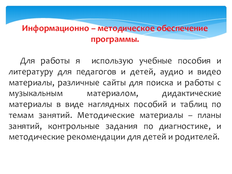 литературу для педагогов и детей, аудио и видео материалы, различные сайты для поиска и работы с музыкальным материалом, дидактические материалы в виде наглядных пособий и таблиц по темам занятий. Методические материалы – планы занятий, контрольные задания по диагностике, и методические рекомендации для детей и родителей.