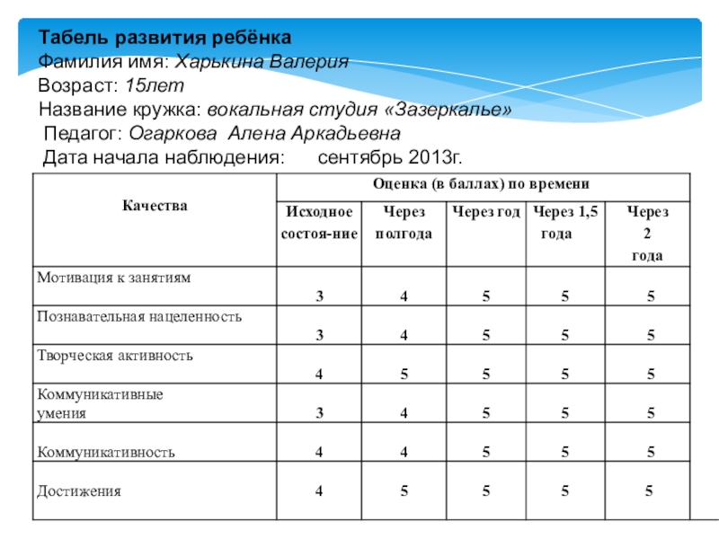 Слайд 25Табель развития ребёнка