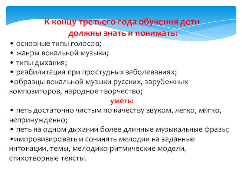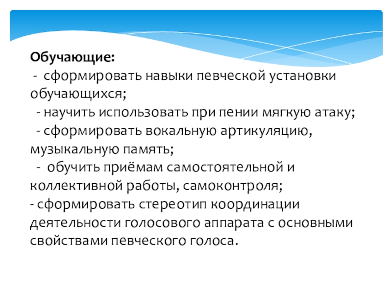 - сформировать стереотип координации деятельности голосового аппарата с основными свойствами певческого голоса.