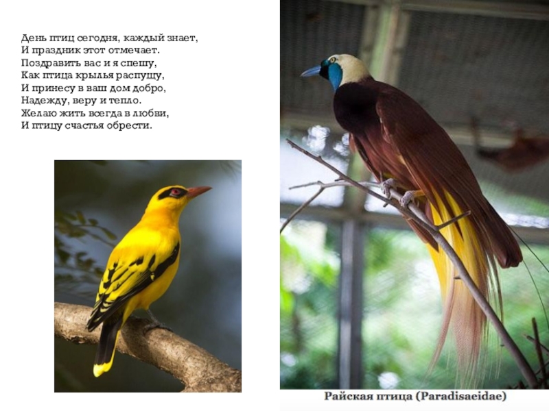 1 «Национальный день птиц в США» — 5 января1 «Национальный день птиц в США» — 5 января 2 «Международный день птиц» — 1 апреля1 «Национальный день птиц в США» — 5 января 2 «Международный день птиц» — 1 апреля 3 «День птиц» — 4 мая1 «Национальный день птиц в США» — 5 января 2 «Международный день птиц» — 1 апреля 3 «День птиц» — 4 мая 4 «Международный день перелетных птиц» — вторая суббота мая