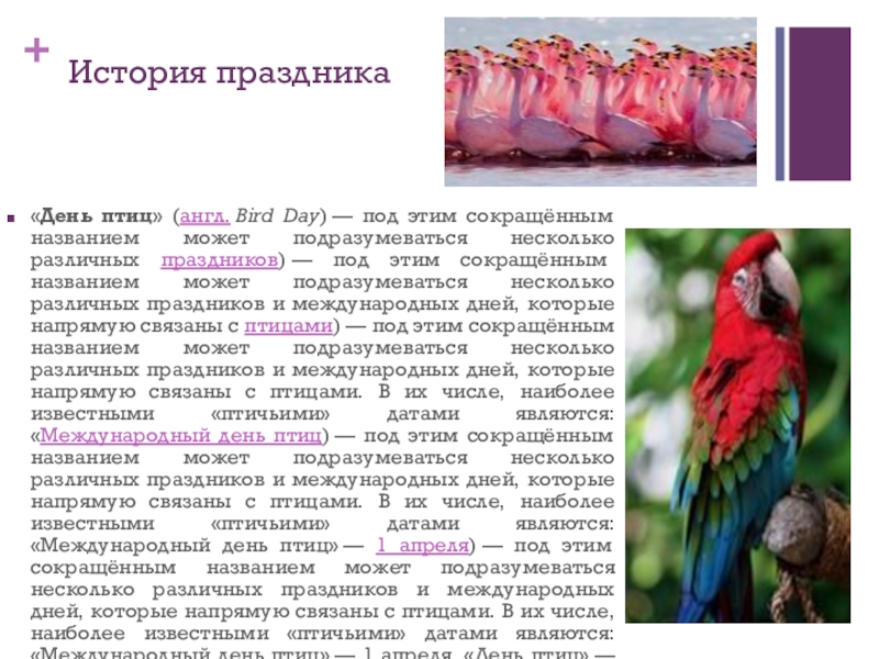 несколько различных праздников) — под этим сокращённым названием может подразумеваться несколько различных праздников и международных дней, которые напрямую связаны с птицами) — под этим сокращённым названием может подразумеваться несколько различных праздников и международных дней, которые напрямую связаны с птицами. В их числе, наиболее известными «птичьими» датами являются: «Международный день птиц) — под этим сокращённым названием может подразумеваться несколько различных праздников и международных дней, которые напрямую связаны с птицами. В их числе, наиболее известными «птичьими» датами являются: «Международный день птиц» — 1 апреля) — под этим сокращённым названием может подразумеваться несколько различных праздников и международных дней, которые напрямую связаны с птицами. В их числе, наиболее известными «птичьими» датами являются: «Международный день птиц» — 1 апреля, «День птиц» — 4 мая) — под этим сокращённым названием может подразумеваться несколько различных праздников и международных дней, которые напрямую связаны с птицами. В их числе, наиболее известными «птичьими» датами являются: «Международный день птиц» — 1 апреля, «День птиц» — 4 мая, «Национальный день птиц в США» — 5 января) — под этим сокращённым названием может подразумеваться несколько различных праздников и международных дней, которые напрямую связаны с птицами. В их числе, наиболее известными «птичьими» датами являются: «Международный день птиц» — 1 апреля, «День птиц» — 4 мая, «Национальный день птиц в США» — 5 января, вторая суббота мая — «Международный день перелетных птиц) — под этим сокращённым названием может подразумеваться несколько различных праздников и международных дней, которые напрямую связаны с птицами. В их числе, наиболее известными «птичьими» датами являются: «Международный день птиц» — 1 апреля, «День птиц» — 4 мая, «Национальный день птиц в США» — 5 января, вторая суббота мая — «Международный день перелетных птиц», «Национальный день птиц в Великобритании» — 22 января) — под этим сокращённым названием может подразумеваться несколько различных праздников и международных дней, которые напрямую связаны с птицами. В их числе, наиболее известными «птичьими» датами являются: «Международный день птиц» — 1 апреля, «День птиц» — 4 мая, «Национальный день птиц в США» — 5 января, вторая суббота мая — «Международный день перелетных птиц», «Национальный день птиц в Великобритании» — 22 января, «День птиц» или «Обретенье) — под этим сокращённым названием может подразумеваться несколько различных праздников и международных дней, которые напрямую связаны с птицами. В их числе, наиболее известными «птичьими» датами являются: «Международный день птиц» — 1 апреля, «День птиц» — 4 мая, «Национальный день птиц в США» — 5 января, вторая суббота мая — «Международный день перелетных птиц», «Национальный день птиц в Великобритании» — 22 января, «День птиц» или «Обретенье» в русском народном календаре) — под этим сокращённым названием может подразумеваться несколько различных праздников и международных дней, которые напрямую связаны с птицами. В их числе, наиболее известными «птичьими» датами являются: «Международный день птиц» — 1 апреля, «День птиц» — 4 мая, «Национальный день птиц в США» — 5 января, вторая суббота мая — «Межд