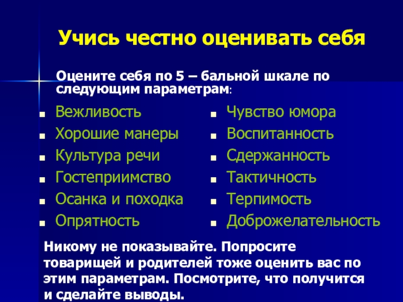 Никому не показывайте. Попросите товарищей и родителей тоже оценить вас по этим параметрам. Посмотрите, что получится и сделайте выводы.