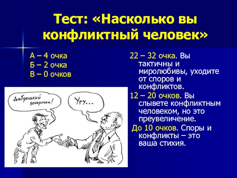 22 – 32 очка. Вы тактичны и миролюбивы, уходите от споров и конфликтов.