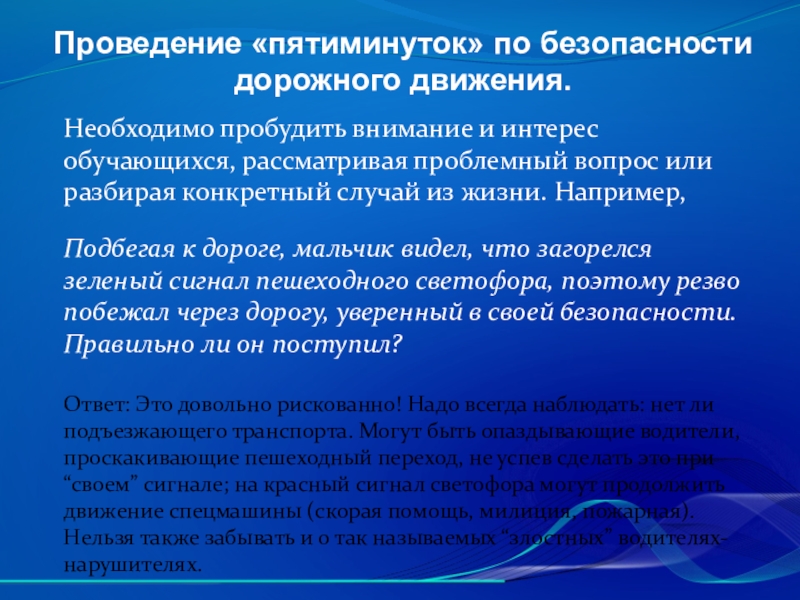 Подбегая к дороге, мальчик видел, что загорелся зеленый сигнал пешеходного светофора, поэтому резво побежал через дорогу, уверенный в своей безопасности. Правильно ли он поступил?