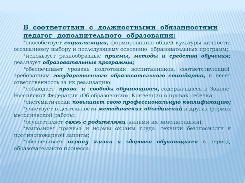 В соответствии с должностными обязанностями педагог дополнительного образования:*способствует социализации, формированию общей культуры личности, осознанному вы­бору и последующему