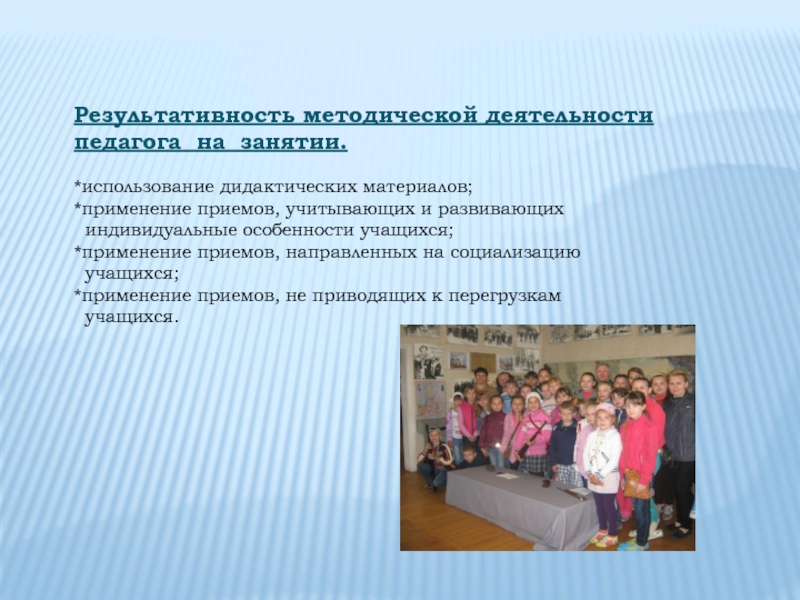 Результативность методической деятельности педагога на занятии.*использование дидактических материалов;*применение приемов, учитывающих и развивающих   индивидуальные особенности учащихся;*применение