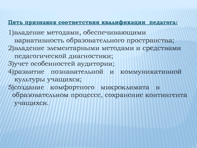 Пять признаков соответствия квалификации педагога:1)владение методами, обеспечивающими   вариативность обра­зовательного пространства;2)владение элементарными методами и средствами