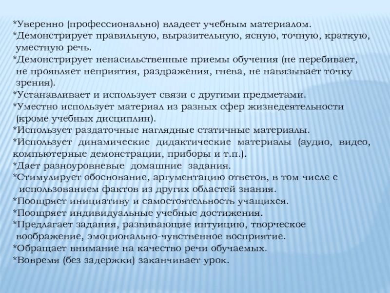 *Уверенно (профессионально) владеет учебным материалом.*Демонстрирует правильную, выразительную, ясную, точную, краткую, уместную речь.*Демонстрирует ненасильственные приемы обучения (не перебивает, не проявляет неприятия, раздражения, гнева, не навязывает точку зрения).*Устанавливает и использует связи с другими предметами.*Уместно использует материал