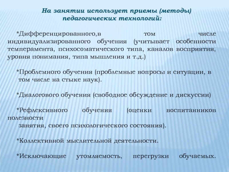 На занятии использует приемы (методы) педагогических технологий:*Дифференцированного,в том числе индивидуализированного обучения (учитывает особенности темперамента, психосоматического типа, каналов