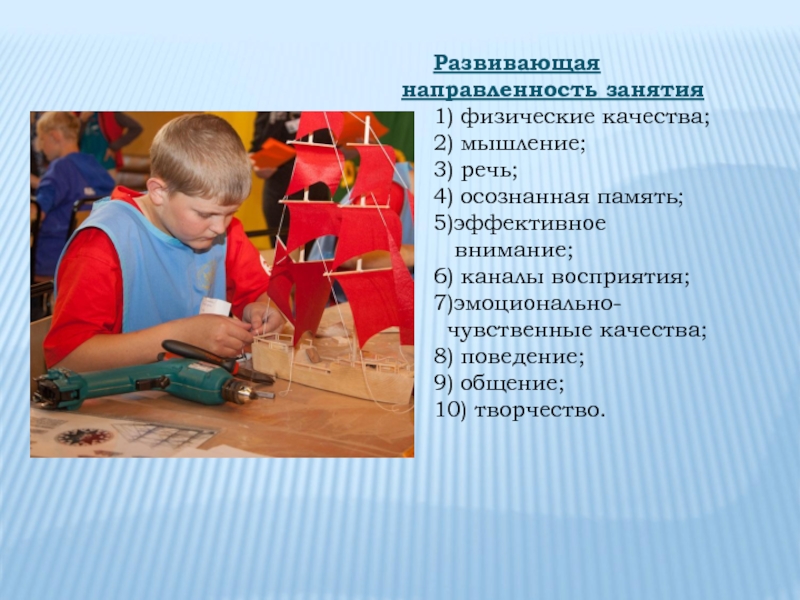 Развивающая направленность занятия1) физические качества; 2) мышление; 3) речь; 4) осознанная память; 5)эффективное   внимание; 6)