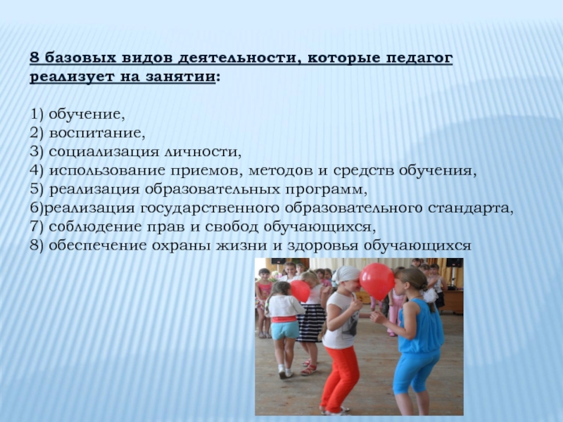 8 базовых видов деятельности, которые педагог  реализует на занятии:1) обучение, 2) воспитание, 3) coциализация личности, 4)