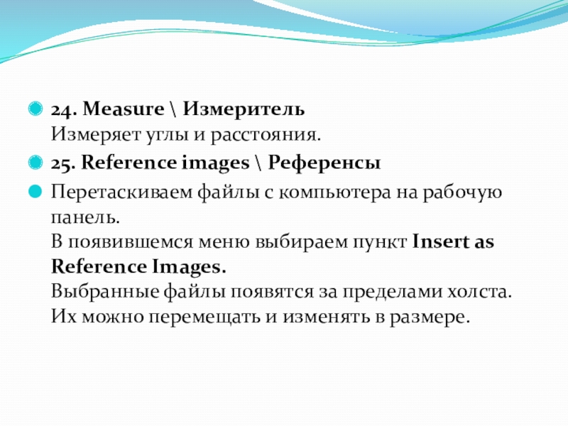 24. Measure \ Измеритель Измеряет углы и расстояния.25. Reference images \ РеференсыПеретаскиваем файлы с компьютера на рабочую