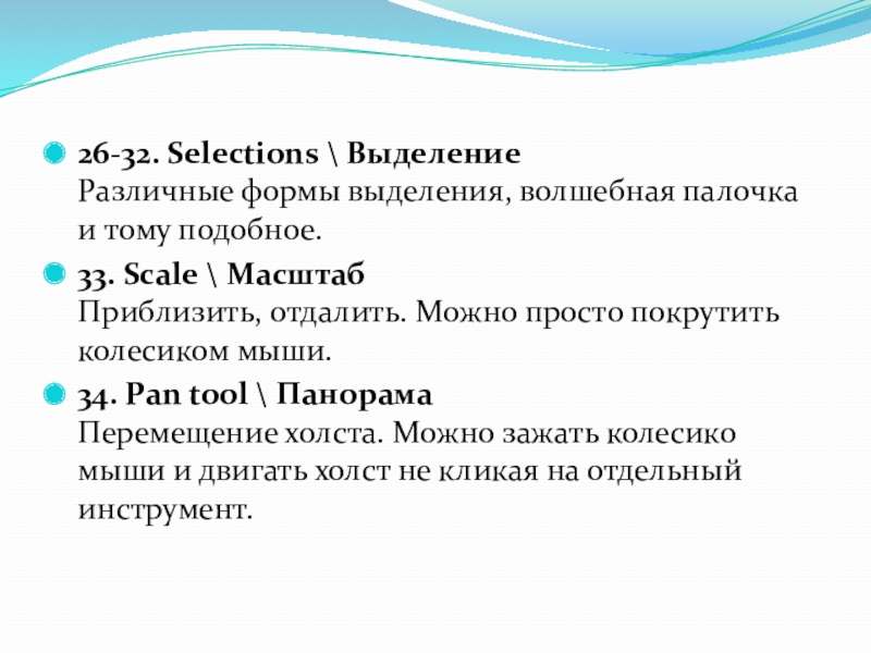 26-32. Selections \ Выделение Различные формы выделения, волшебная палочка и тому подобное.33. Scale \ Масштаб Приблизить, отдалить.