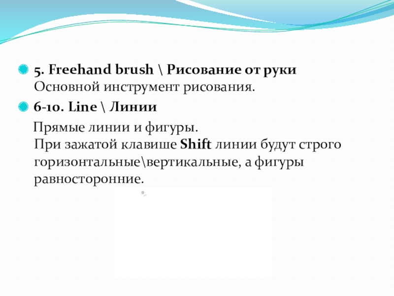 5. Freehand brush \ Рисование от руки Основной инструмент рисования.6-10. Line \ Линии  Прямые линии и
