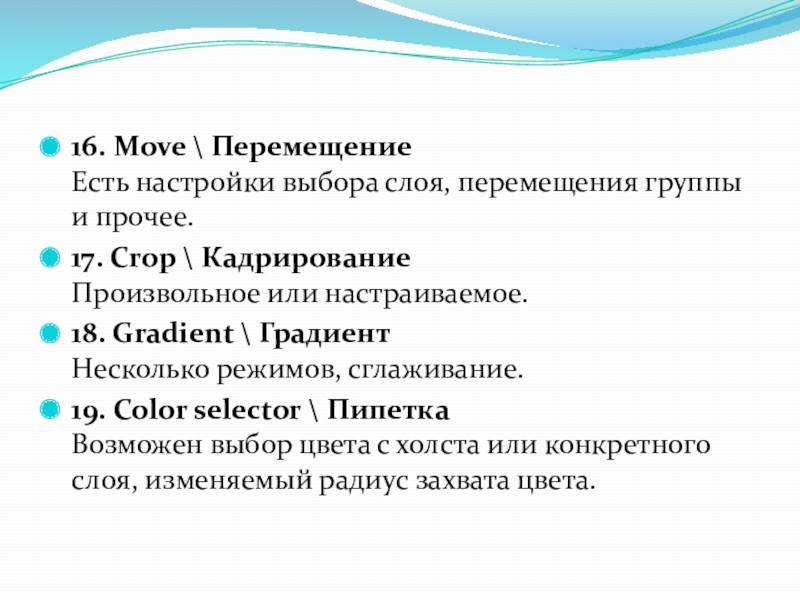 Слайд 1016. Move \ Перемещение Есть настройки выбора слоя, перемещения группы и прочее.