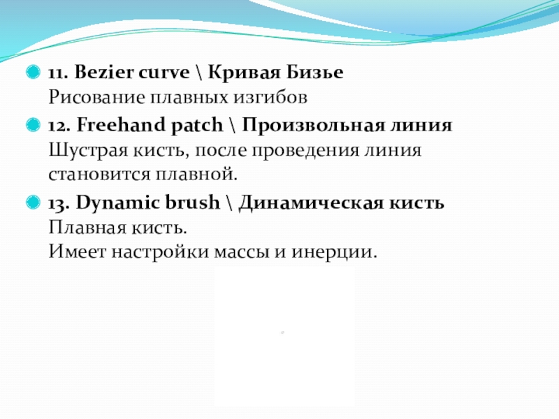 11. Bezier curve \ Кривая Бизье Рисование плавных изгибов12. Freehand patch \ Произвольная линия Шустрая кисть, после