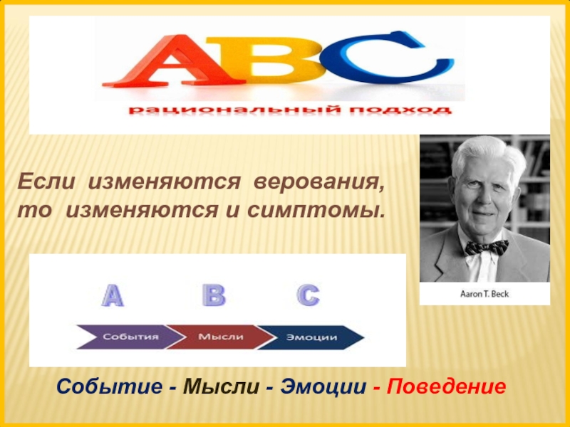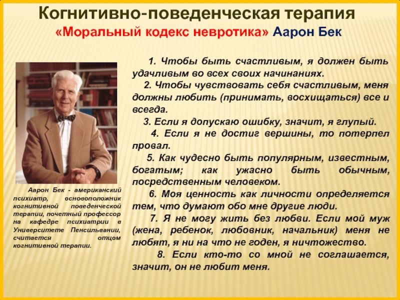 Аарон Бек - американский психиатр, основоположник когнитивной поведенческой терапии, почетный профессор на кафедре психиатрии в Университете Пенсильвании, считается отцом когнитивной терапии.